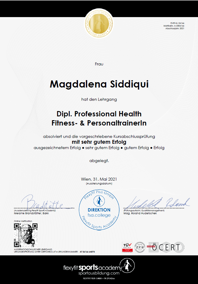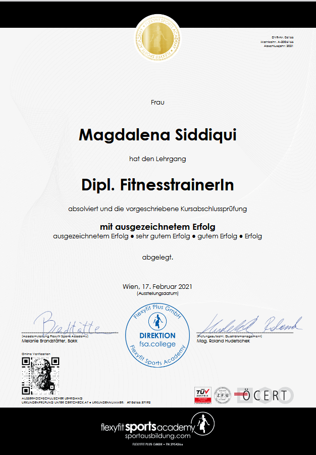So hat meine Leidenschaft zu Sport und Fitness begonnen und wurde immer größer, sodass ich diese mittlerweile zu meinem Beruf gemacht habe. Bei der Flexyfit Academy in Wien habe ich meine Ausbildung zur Dipl. Professional Health Fitness & Personal Trainerin gemacht.